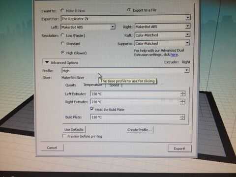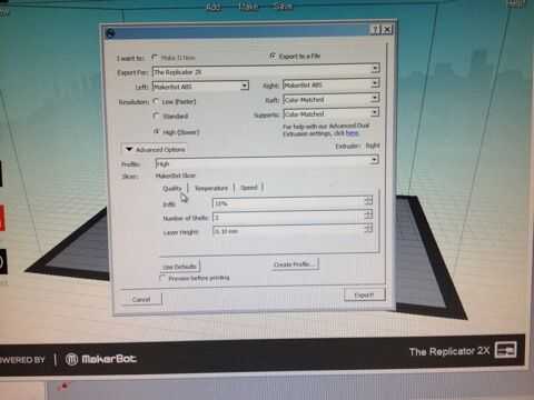 El modelo entonces se debe exportar como un archivo .stl. Una vez hecho esto, añadir en tu Makerware. Gire el adorno que es como un árbol de pie. Asegúrese de que está acostado. Entonces, escala el ornamento en la dirección z a 2,6 pulgadas. A continuación, haga clic en hacer. Establecer la extrusora a cualquier extrusora prefiere. Establezca el relleno en 10%. Ajuste el calor de la placa de construcción a 130 grados centígrados. A su vez apoya sobre. Encienda las balsas. Entonces, la exportación y está listos para ir.
