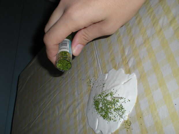 * Opciones: Aplicar pegamento líquido utilizando un pincel para hacer formas (como árboles de Navidad) y luego aplicar brillo en sólo esas áreas.