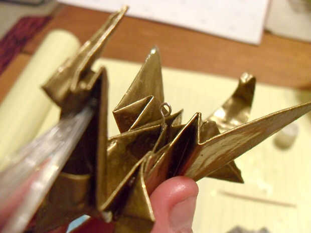 Cuando el pegamento esté seco, uso de cuerdas o cintas para hacer un ciclo de suspensión, corriendo por el perno de ojo y anudar en la parte superior. Usé cadena de plata de la caja del arte de mi abuela para una mirada casi invisible cuando está colgado de un árbol.