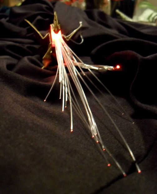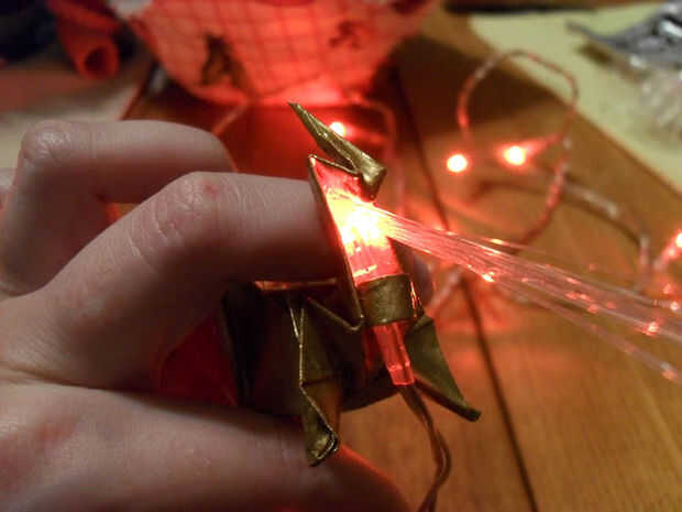 Donde colgar tu adorno depende de usted. He encontrado que mina trabajó bien en mi mini árbol de Navidad y en una corona, ambos colgados con luces LED. Asegúrese de Asegúrese de que haya un foco situado cerca de la ubicación colgar el ornamento, que vas a introducir la bombilla en ese arnés de pecho que hicimos anteriormente. Esto mantendrá la punta de la luz contra el conjunto de filamentos, enviar luz a través de ellos. El brillo del LED va a ser más fuerte cerca del pecho / boca, emulando la garganta de Smaug de película de manera brilla intensamente antes de respirar fuego.