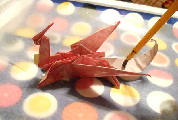 Origami es hermosa, pero muy delicado. Para preservar y proteger a Smaug de rasgado y plegado, que vamos a aplicar unas capas delgadas de resina transparente. He usado resina de fibra de vidrio Bondo, que requiere un endurecedor y tiene un tiempo limitado de trabajo.