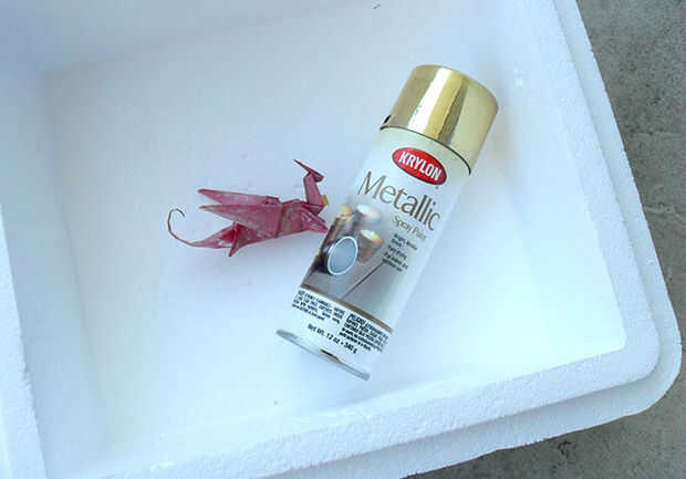 Utilizar pintura en aerosol en un área bien ventilada. Si no tienes un área de taller, puedes improvisar una cabina de rociado. Usé un viejo refrigerador de Omaha Steaks de poliestireno. Se trataba de la profundidad de un cajón del calcetín. La llanta impidió que el viento que sopla sobre Smaug y ayudó a contener el aerosol. Usar esto en mi balcón para una experiencia libre de desorden.