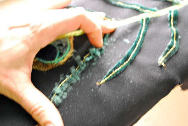 Una vez que el terciopelo se cose hacia abajo con el oro, es hora de fuzzing y de pelusa.