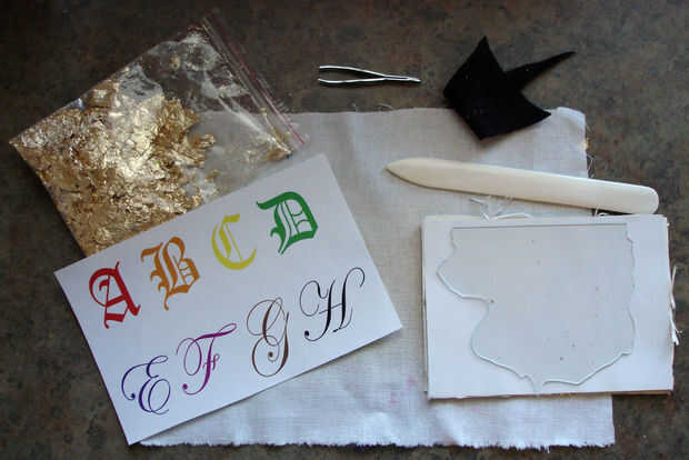 Mayoría de estas cosas que ya tendrás todo. La hoja de oro y fieltro pueden obtenerse de una tienda de artesanía. Nota que estoy usando una bolsa de retazos de hoja en lugar de un libro mucho más caro. Supongo que un libro de hoja de calidad, todo liso y brillante, funcionaría; sin embargo, el libro que tengo es prácticamente arrolló arrugada hoja de papel encerado. Funciona, pero no es fácil de obtener en el papel de cera y plancha con el papel de cera Unido va a arruinar el papel que rodea el gild.
