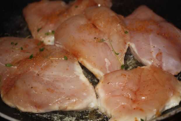 Añadir un chorrito de aceite de oliva a una sartén y cocine el pollo durante 4 o 5 minutos hasta cocida, luego presenta los pechos en una bandeja y dejan en el horno a fuego lento.