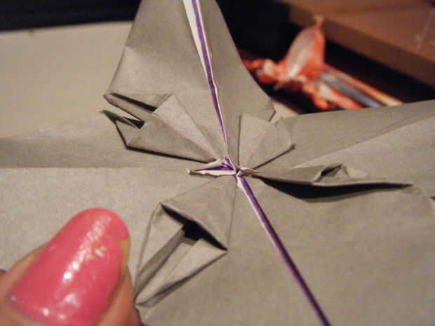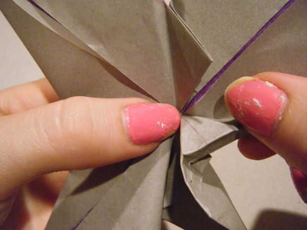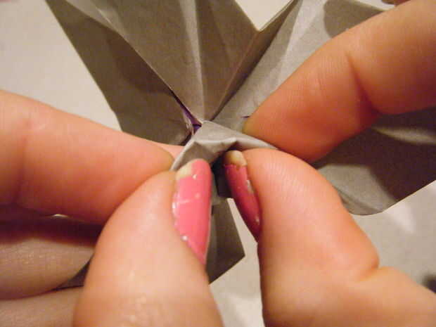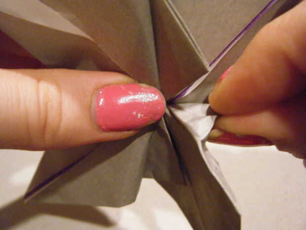 Tire de cada lado del triángulo.  Doblar hacia atrás (montaña, recuerda?) a lo largo de los pliegues que ya hiciste.  Doblar los lados debajo del triángulo.  Repita en los otros cuatro triángulos.