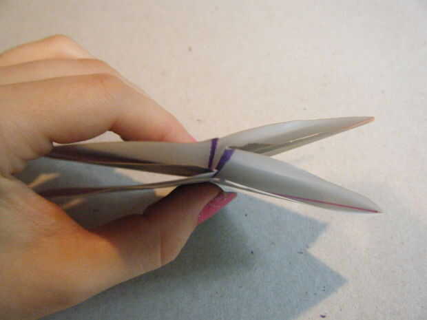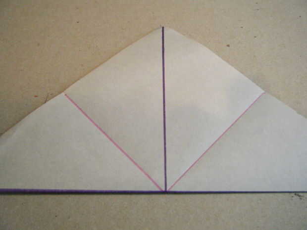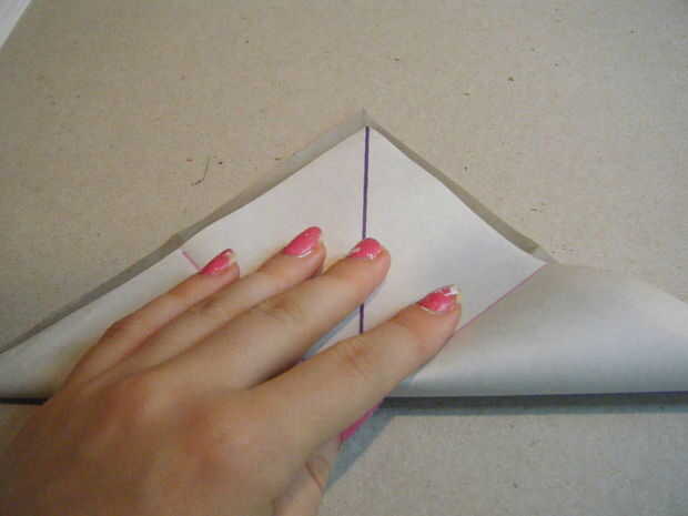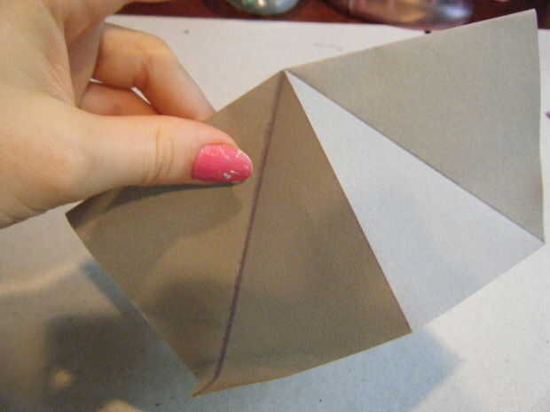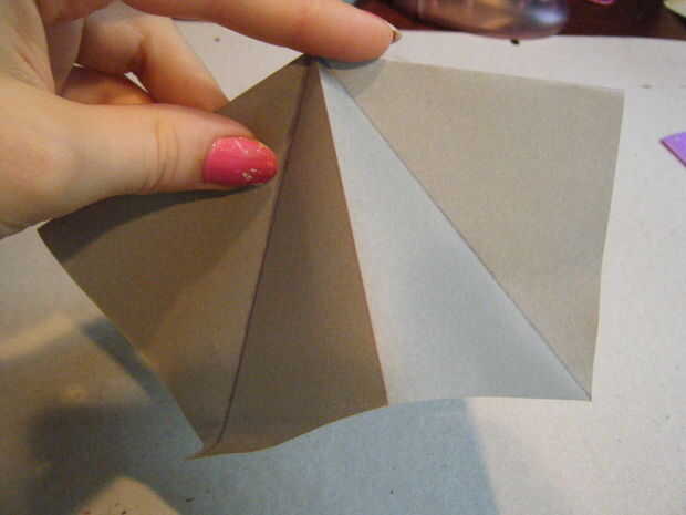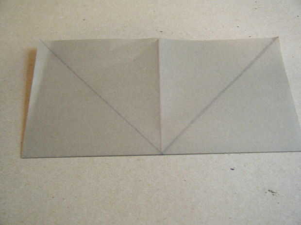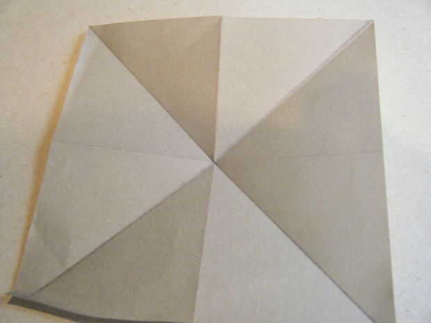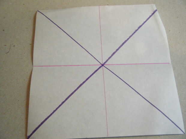 Voltear el papel por lo que es la parte coloreada. Doblar diagonalmente en ambos sentidos. Se despliegan.
