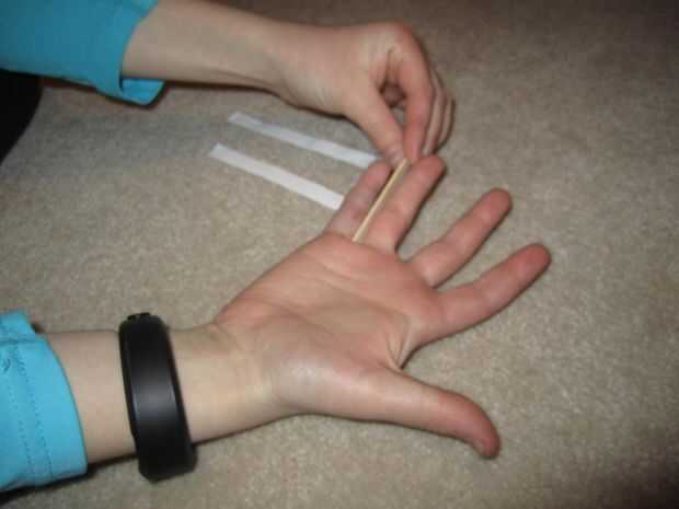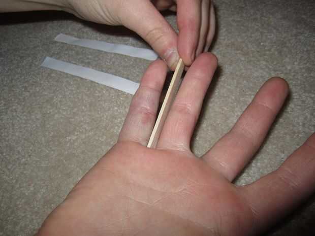 Coloque el palillo justo entre los dedos que están heridos y cortado a la medida para que no pegue hacia fuera demasiado.