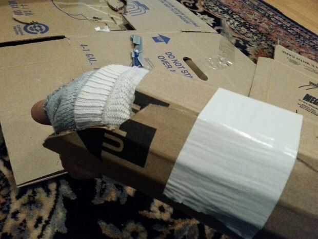 - Ponga su mano en el calcetín, luego doble el extremo del calcetín encima de la mano de acolchado adicional y más o menos ocultarla debajo de la cartulina.