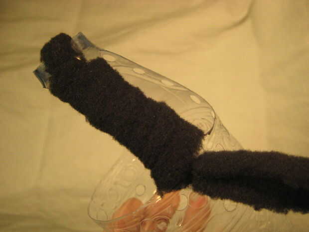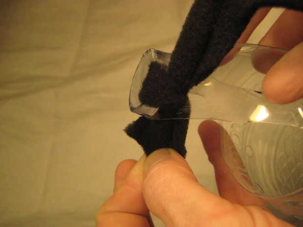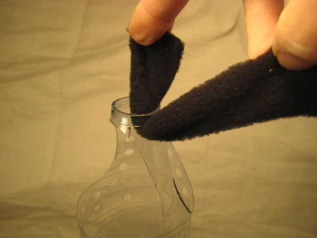 Comience en la parte superior de la barra entre el pulgar y los dedos. Una vez que se encaje a través del orificio, envuelva el paño grueso y suave hacia abajo alrededor de la barra 5 o 6 veces (figuras 2,3,4) para hacer agradable y acolchados y sin los bordes de la botella están mostrando.
