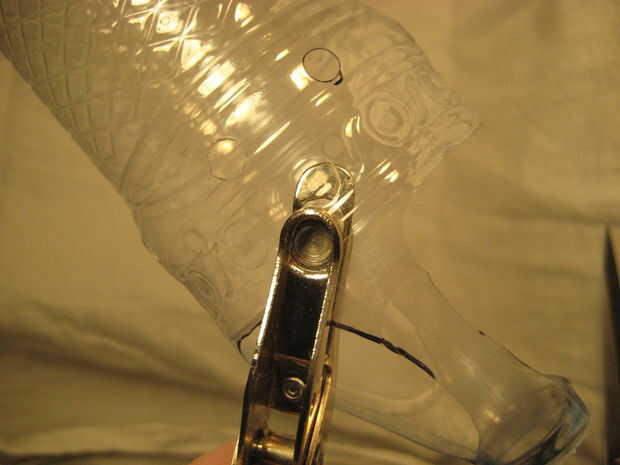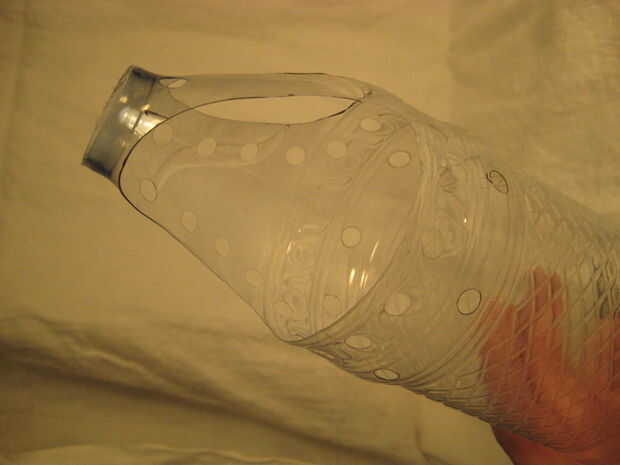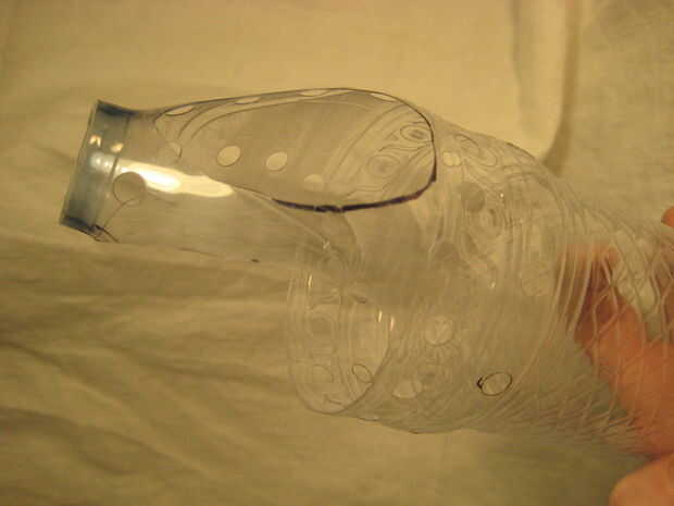 Iniciar perforación en la base de la misma tira y trabajar su camino en cuanto se puede ir hasta llegar a la cima. Se llega a un punto donde no puede irrumpir el plástico en la parte superior del cuello de la botella, por el espesor. Continuar la perforación en el otro lado de los agujeros del dedo y el pulgar en la parte superior y terminan en el primer hoyo.