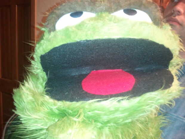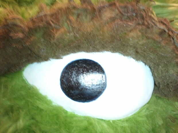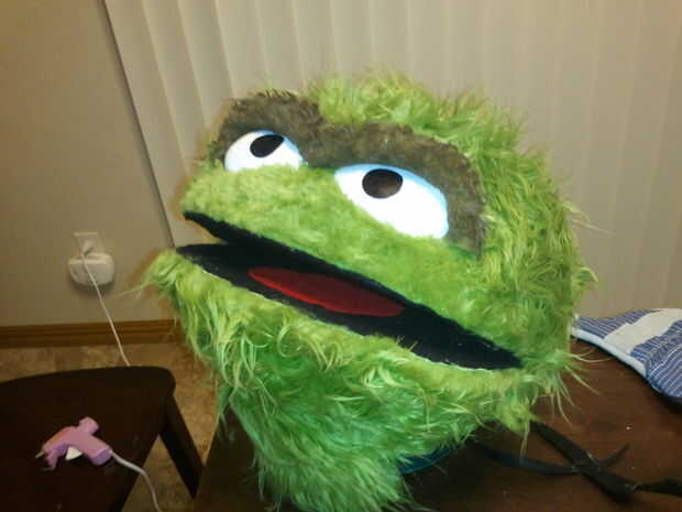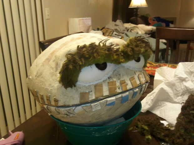 La parte más difícil estaba tratando de averiguar cómo mover las cejas de Oscar. Esto era algo que consideraba no haciendo. Pero agregar que algo extra. Así que lo que hice fue tomé una percha de alambre y lo dobló. He utilizado 5 bandas de goma que une a la parte superior de la cabeza de Oscar y luego enrollado alrededor del gancho cerca de mi dedo. Presione hacia abajo en el gancho con mi dedo puntero las cejas suben y luego dar marcha atrás debido a las bandas de goma. Sólo utiliza exceso diversión verde, cortarlo, pegué y entonces utiliza pintura en aerosol color marrón, para la ceja única. Pongo una pequeña cantidad de pegamento caliente en el centro de la ceja para mantenerlo.