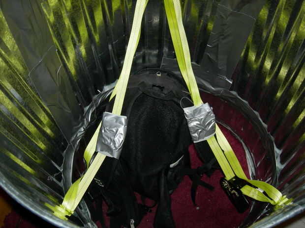 hacer un lazo robusto en la parte superior trasera de la lata. pasar la cinta por aquí para completar las correas. Ahora coge tu mochila y cinta de la cinta a sus hombreras. Esto le permitirá tener el peso de la mochila descansa sobre sus hombros y las caderas.
