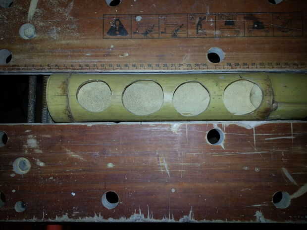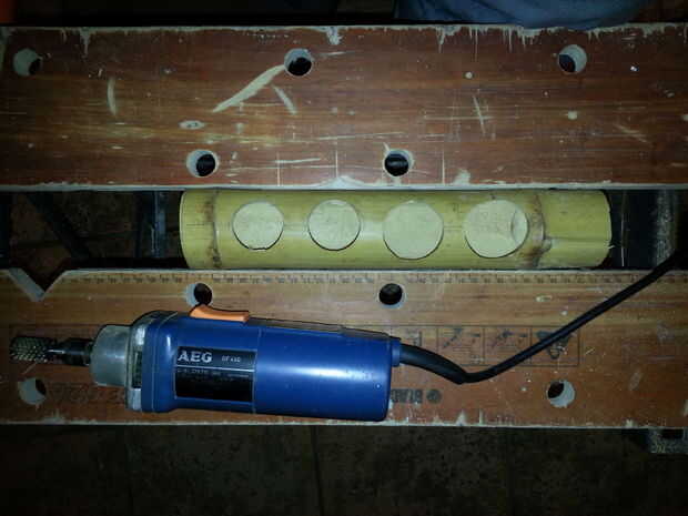 Cuando has hecho el paso anterior, que el don´t de polos encaja en los orificios porque los agujeros son a pequeñas. Lo que tienes que hacer es rayar los diámetros un poco para que los postes encajen en los agujeros. Don´t hacer un círculo perfecto, mirada en los postes de bambú. Debe caber en estos agujeros.