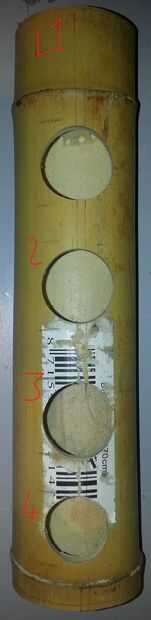 En mi caso, me eligen para los postes de bambú de izquierda y derecha (más gruesas) y escribió esto también en los cuatro postes que deben caber en aquí. Me dio a los postes de bambú en un número de 1 a 4 y escribió también esos números en los postes de bambú grueso (foto 34a, b, c).
