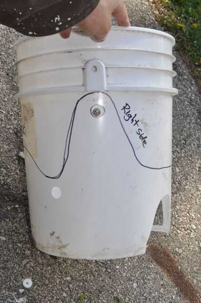 Los otros dos agujeros son inferiores y uniformemente espaciadas entre las lengüetas laterales y el centro de la parte posterior de la cubeta. Estos dejar que la cuerda pase por ir a la parte exterior de la cubeta, alrededor de la parte posterior del oscilación y a través el otro conjunto de orificios.