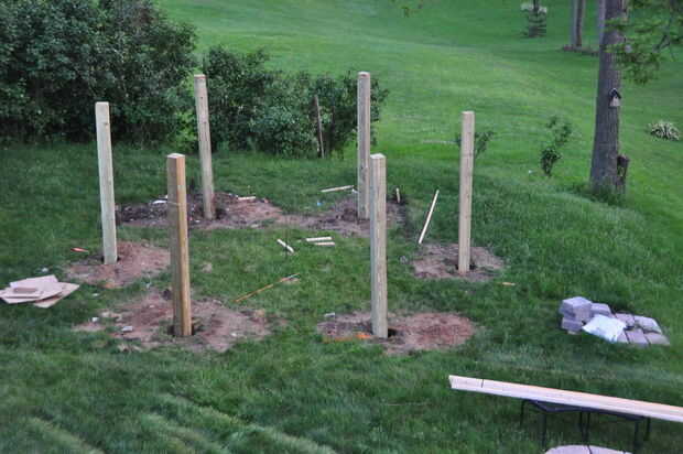 Para crear una cuadrícula para mi diseño, poner una varilla de acero en el centro del espacio, mide la longitud de mis vigas (pies 8 en mi caso) y había pintado un círculo. Que era un buen punto de partida. Los postes se terminan sólo dentro del círculo.