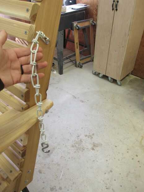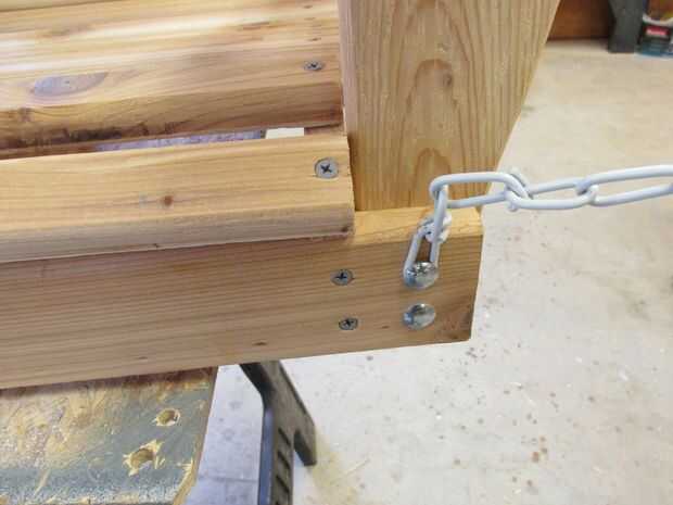 Una vez seco el columpio, empecé a añadir la cadena. Cortar dos tiras de 8 links cada (cada enlace es dos lazos) y luego perforó un agujero en cada lado cerca de la cima. A continuación os adjunto la cadena hacia el lado con el perno de carruaje, arandela y Asamblea de tuerca de nylon. Nota: antes de apretar hacia abajo la tuerca Asegúrese de que el enlace está inclinado como en la siguiente foto.