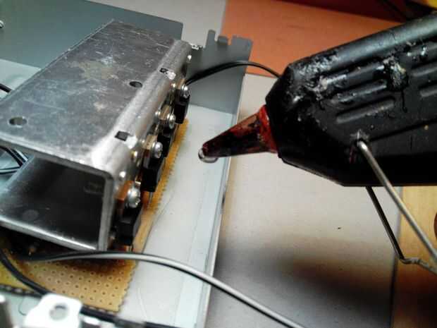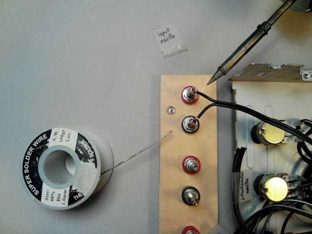 Para finalizar la caja, todos los cables del circuito electrónico conectados y soldados a sus conectores (interruptores, potenciómetros, enchufes de plátano, jack hembra, led, cables de suministro de energía...), luego las tiras de madera y placa perforada se pegan a la caja usando la pistola encoladora.