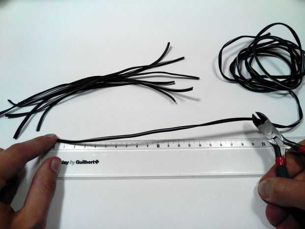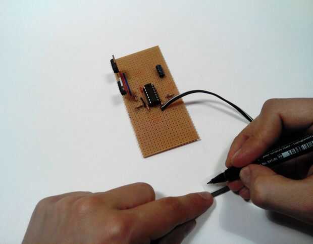 Los interruptores, el LED, los potenciómetros, los conectores hembra de jack y los conectores de alimentación se conectará a la caja del proyecto. Para conectarlos a la placa perforada, es necesario utilizar cables eléctricos: cortar tanto cables eléctricos según sea necesario y utilice cinta adhesiva para conductos y pluma para identificarlas.