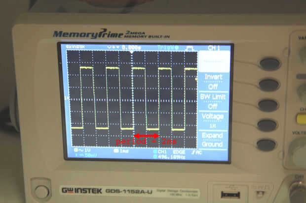 Como se indica en la imagen superior, un ciclo se completa en 2 divisiones de grilla horizontal. Como se indica en la parte inferior de la pantalla, he marcado tiempo/div a 1ms, así que 2 divisiones equlas 2ms (0,002 segundos).
