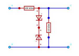 Entrada - sonda. Entrada B - "Cocodrilo" - a la tierra. Entrada C - canal L o R. entrada D - tierra (común) para que la Asamblea toma sólo 4 piezas (+ Jack mono 3,5): resistencia de 100 k - 1 pc. Resistencia de 10 k - 1 pc. Zener a 1,9 V - 2 pcs. Resistencias de toman el poder no menos de 0,5 vatios y cualquier zener a 1,9 voltios.