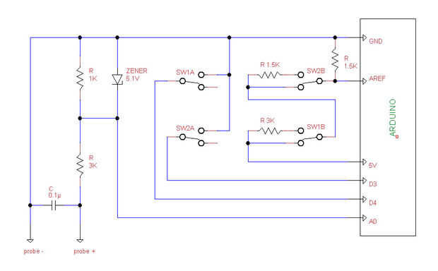 El segundo polo de cada interruptor es conectado a una entrada digital. Podemos leer este pin para ajustar automáticamente la escala de voltaje.