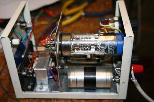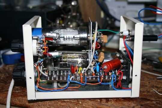 a continuación se muestran imágenes del osciloscopio durante la construcción y terminado.  El alcance mostrado arriba no incluye el potenciómetro de atenuador de X que se muestra en el diagrama del circuito.  También he añadido un condensador de 68pF entre ánodo Y amplificador y la red de posición de la base de tiempo pentodo para proporcionar una sincronización. señal.