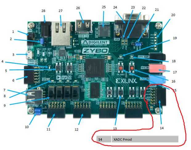 El Xilinx Zynq IC cuenta con el "XADC" convertidor analógico a Digital. Las muestras XADC a un máximo de 1MSPS (megamuestras por segundo), salida de un valor de 12 bits. Este ADC tiene un rango de entrada de 0-1V.