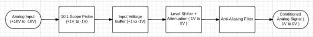 Porque no es muy útil un osciloscopio entrada entre 0-1V, se debe añadir circuitería analógica frente a la entrada del ADC para escalar y cambiar el voltaje de entrada, vea el diagrama de bloques para este paso.