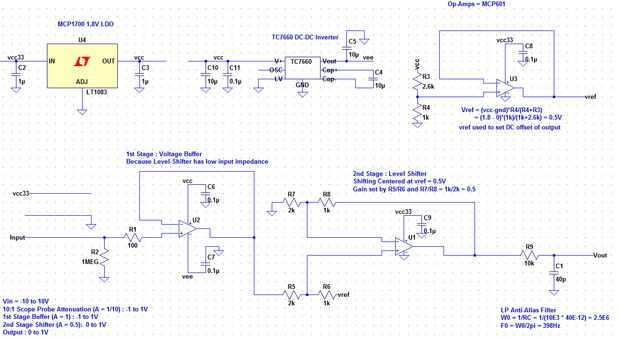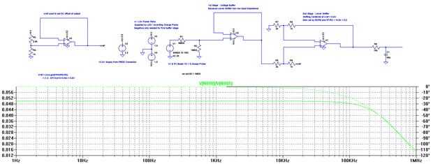 Este diagrama de bloques se implementó usando los circuitos que se muestra en el esquema LTSPICE/simulación (archivo PDF para la simulación). Según lo deseado, la ganancia es de 1/20 = 0.05 hasta que el filtro anti-aliasing hace que dejar alrededor de 400kHz (frecuencia de nyquist = 500kHz para 1MSPS ADC).