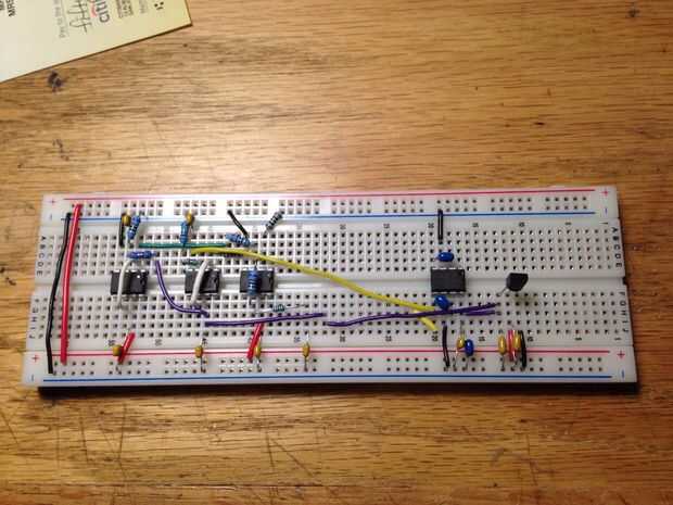 He implementado este diseño en un protoboard (no teníamos tiempo para diseñar un PCB) utilizando a través de componentes de agujero. En el segundo esquema LTSPICE (no simulatable, solo usado para el diseño de circuito para pedidos de piezas), así como el circuito construido real así se muestran los componentes utilizados para aplicar este diseño. Los 3.3V y GND provienen del conector XADC PMOD.