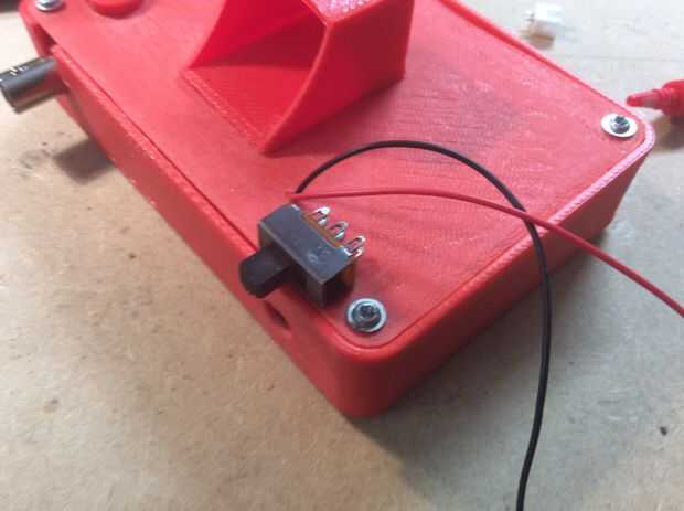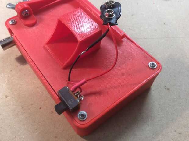 Pegue el conmutador deslizante en la parte superior de la caja posterior. Soldadura del conector de la batería de 9v y los 2 cables que usted soldado antes del interruptor. Usé un tubo del encogimiento del calor con las soldaduras. La última cosa que hacer es escribir el nombre de la funcionalidad de los botones. Lo hice con un marcador permanente.