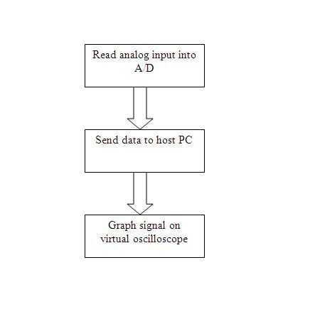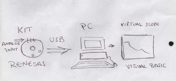 Las entradas de A/D se utilizan como puerto de las señales analógicas de entrada; se convierten en el microcontrolador M16C en el modo de repetición AD. El host PC lee el número digitalizado en los tres registros de cada canal de AD. El anfitrión dibuja las señales en la interfaz de osciloscopio virtual.
