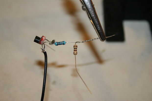 Conecte una pata del resistor de 100 Ohm al extremo libre de la resistencia de 10K.