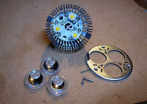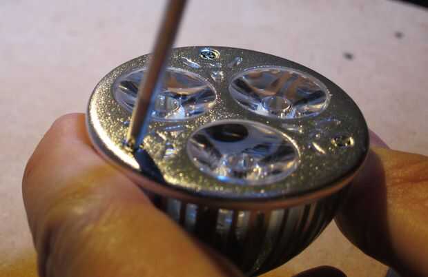 El primer paso es desmontar la bombilla quitando los tres tornillos en la placa frontal. Son pequeños y usted necesitará otra vez, no perderlos! Retire con cuidado la placa de metal y los tres lentes de plástico para exponer la placa del circuito con los tres LEDs