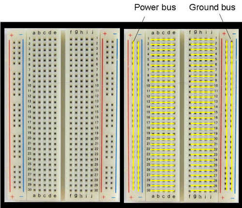 La foto muestra el conexionado de los agujeros de la protoboard. Las líneas amarillas representan los orificios que están conectados. Así que si se inserta un alambre a un agujero en la línea amarilla, se conectará automáticamente a todos los orificios en la línea amarilla. Así las filas horizontales están conectadas entre sí y los dos rieles verticales a cada lado de la placa son las filas de autobuses de la poder, y están conectados juntos. Las filas de autobuses de energía más comúnmente se utilizan para conectar la fuente de energía o voltaje y tierra.