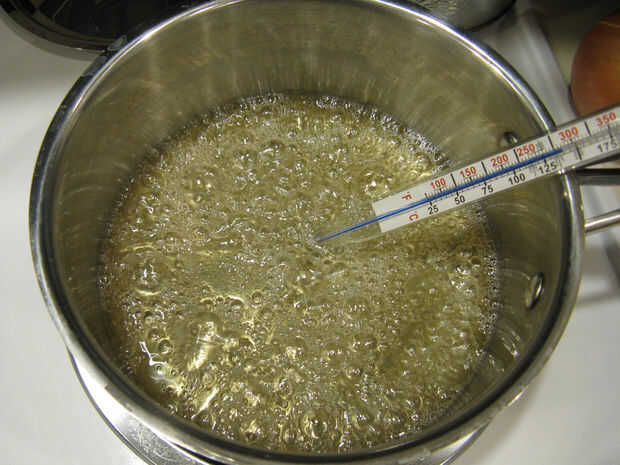 Azúcar necesitará agua para conseguirlo disuelto. Para 2 tazas de azúcar aquí, 1/2 taza de agua debe ser suficiente. Si no es así, añadir un poco más, pero más añade, más tiempo tardará. Calor a fuego medio y cuando esté todo disuelto se vaya claro. No revuelva después de eso. Si hay los cristales de azúcar en el lado de la sartén, les salen con un cepillo mojado o algo. Luego enganche en su termómetro de caramelo. Usted se dirige a 300 º f.
