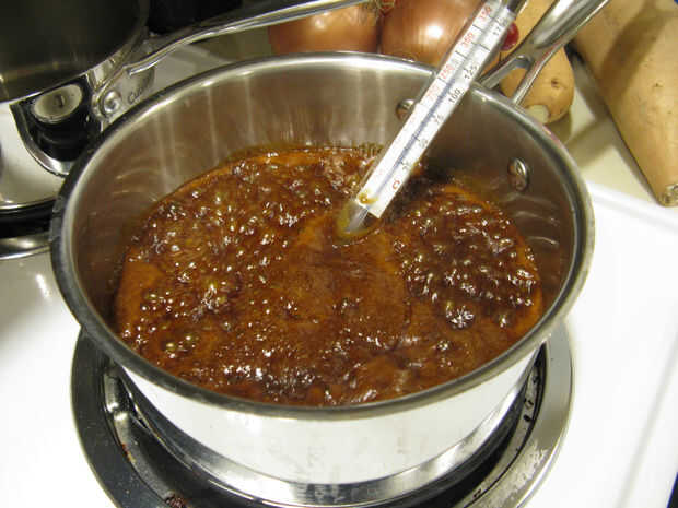 Al llegar a la fase de bola dura, exigente suavemente encima de la olla y vierta en el recipiente untado con mantequilla. No raspe lo, o puede llegar a cristalizar. Una vez que se vierte, permita que se enfríe a temperatura ambiente o en refrigerador. Limpios tus platos, ir a la cama, recoger otra vez el día siguiente.