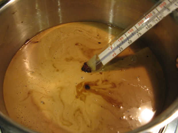 Mezclar la crema y el café con el dulce de leche. ¿Esperé demasiado tiempo y el dulce de leche fue una masa espesa, pero sabe lo que? Está bien, funcionó bien, tuve que revolver un poco con el calor en. Lo necesario para cocinar a la fase de bola dura, que es 250ºF (121 º c). Si vas demasiado baja será suave y pegajosa, y si vas demasiado alta puede ser demasiado difícil.