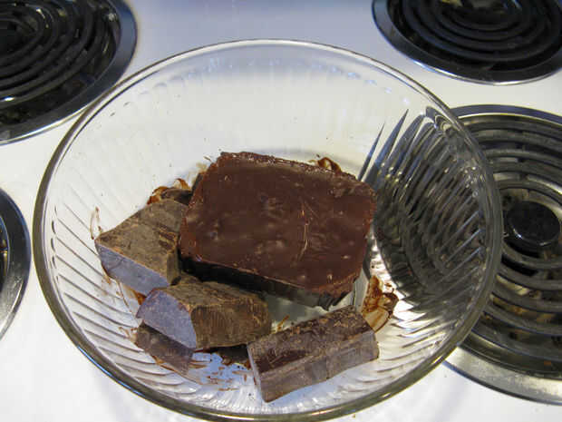Paso uno es fundirlo. Usé el horno de microondas para la facilidad y sencillez. Picar en trozos pequeños (o no, eso está bien) y zap para 20 segundos y removemos bien y repetir. Desea lo que es apenas se derrite el chocolate.