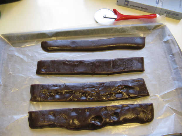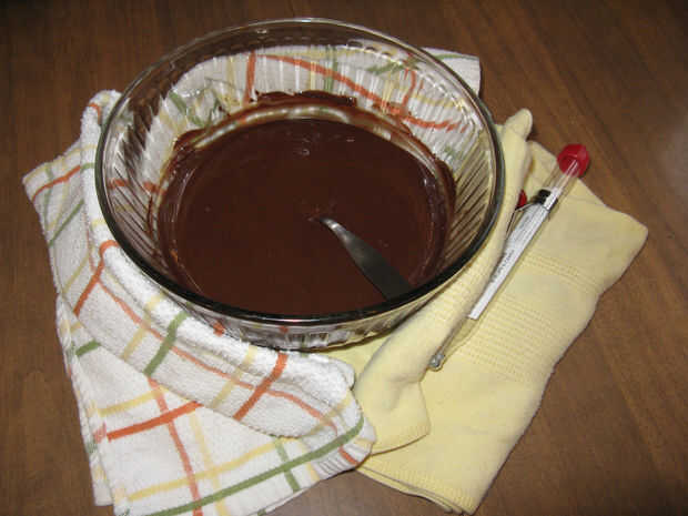 3. prueba. Necesita ver si es "genio." Use un cuchillo frío o espátula un pequeño trozo de papel de cera y mojar el borde en el chocolate para recoger una pequeña inmersión. Set y deje que se enfríe a temperatura ambiente. Sin prisas, darle un par de minutos. Si es en Temple será duro y oscuro, y puede dar un empuje suave sin dejar una marca. Si no está en el genio todavía será más ligero en color y suave y melty, e incluso un poke suave deja una huella. Si no se ve todavía, seguir revolviendo lo y zap 10 segundos evitar solidificación demasiado.