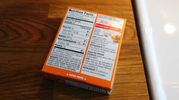 Primero siga las instrucciones de su paquete de postre de gelatina. En este caso la gelatina recomienda calentar la mitad del agua necesaria y disolviendo el polvo en el agua caliente, luego agregar a la segunda mitad de agua fría para bajar la temperatura antes de refrigerar. Esto es exactamente lo que haremos, pero con una pequeña adaptación.