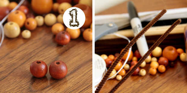 Seleccione dos granos de tamaño similar y coloración de la pila y tire de dos de los limpiapipas color mismo. Nota: he encontrado que los granos de madera mediano funcionan mejor. Los pequeños son más difíciles para pequeñas manos hacerlo pero todavía puede utilizar si desea hacer una. Los realmente grandes es necesario pegamento si no que los agujeros en el centro son demasiado grandes para sostener en los brazos y la cola por la fricción y la presión solamente.