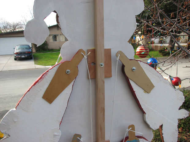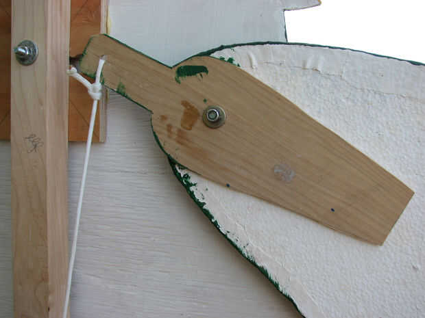 Corte 15 de 4 "x 4" x 1/8" madera contrachapada en la forma por encima de los brazos de palanca. Las cuerdas se unen 4-4.5" desde el punto de giro dependiendo de la distancia desde el poste central. Perfore un agujero de 1/2" para el punto de pivote.