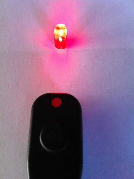 Repita con el láser rojo y el osito de goma roja. Se puede predecir, el oso ilumina de rojo, como se puede ver que está pasando la luz roja se transmite a través de la gominola roja... luz roja.