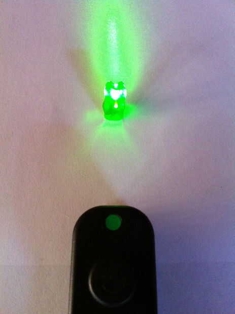 Ahora el brillo del láser verde a través de la gominola verde. El oso "verde", y se puede ver que la luz verde pasa a través de gominola... la luz verde se está transmitiendo.