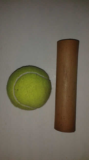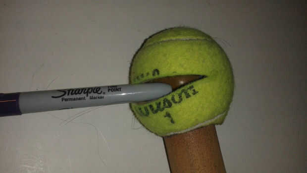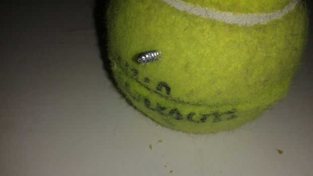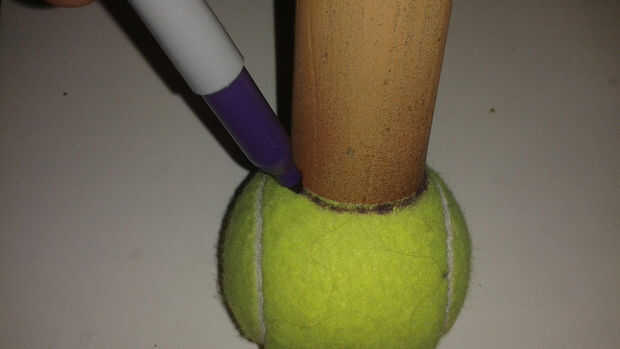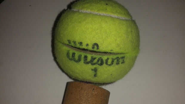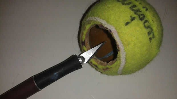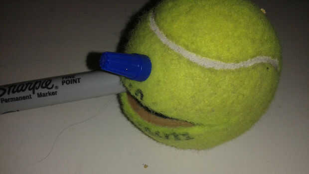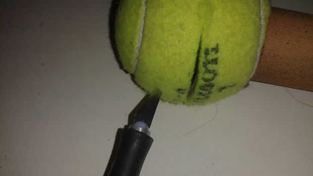 Quería montar la pelota de tenis en un mango con un altavoz dentro. El mango tiene una olla para el control de pitch y un pulsador para el control de las notas. Encontré un trozo de PVC que era el tamaño perfecto para contener una batería y todos los componentes. También quería algo más divertido que una pelota de tenis aburrido, así que decidí cubrir la bola con fuzzy material para crear una cara del personaje.