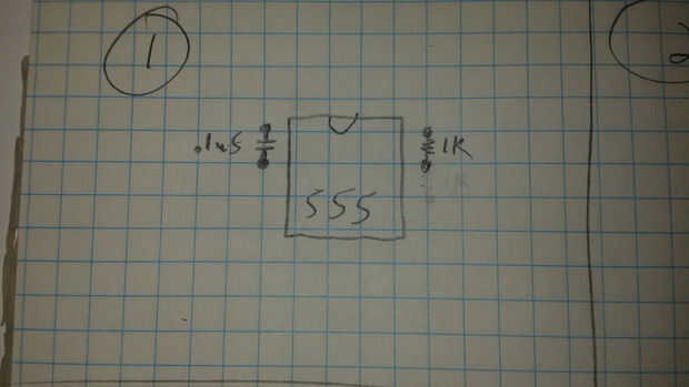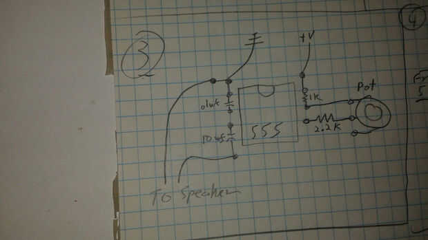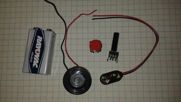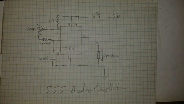 He construido un circuito básico de audio oscilador 555 con una olla para controlar el pitch y un botón para controlar la longitud de notas. Este es un circuito muy fácil y todas las piezas están disponibles en su local de Radio Shack (pero honestamente, oler mal - ser paciente y ordenar piezas en línea para un gran ahorro). Tenía todas estas parte en mi gabinete de componente. Aquí es lo-