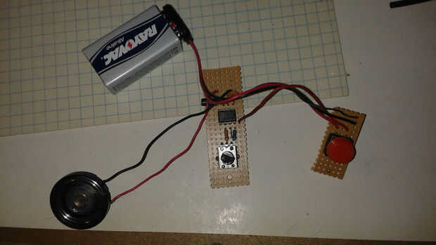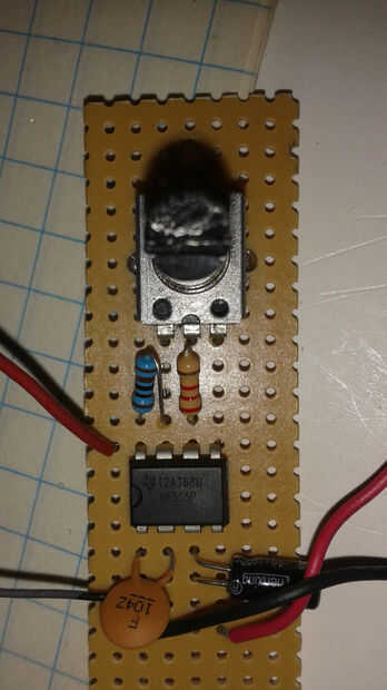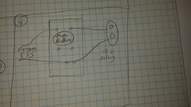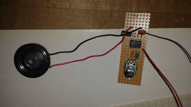 Coloqué el 555 en la tira de perfboard. He instalado la tapa de.1 uf entre el resistor de los pines 1 y 2 y la 1k entre los pines 7 y 8. Solía el condensador exceso de plomo en el pin 2 Conecte al pin 6 en el tablero. Añadí un pedazo corto de tubería con el conductor de resistencia exceso en pin 8 encogible y había conectado al pin 4 encima de la anterior conexión. Me voltea el tablero encima y agrega la resistencia de 2.2 k del pin 6 al perno de centro de la maceta de adorno. Utilicé el cable resistor exceso en el pin 7 para conectar a la patilla izquierda del trim bote. Añadí el cap de 10uf a pin 3 y conectarse al otro lado del cable del altavoz. Conecté el suelo altavoz a la clavija 1. He añadido un v + cable al pin 8 y una toma de tierra al pin 1. Creé una segunda tabla con un botón y esta conectado entre el pin 8 del 555 y el terminal positivo de la batería. Conectado a tierra de batería a la clavija 1 de la 555. Ver los diagramas arriba.